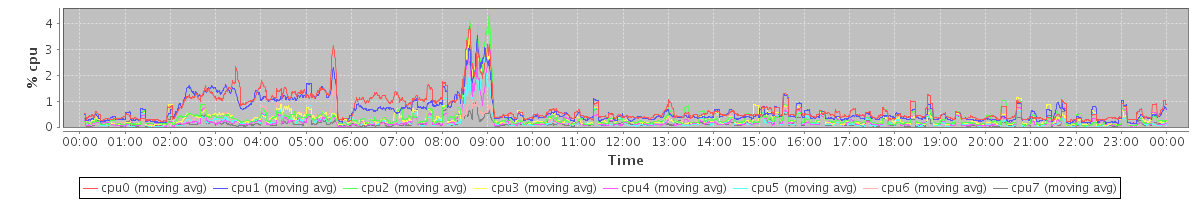avg(cpu0) = 0.12 avg(cpu1) = 0.09 avg(cpu2) = 0.03 avg(cpu3) = 0.03 avg(cpu4) = 0.02 avg(cpu5) = 0.02 avg(cpu6) = 0.02 avg(cpu7) = 0.01