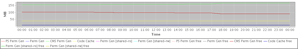 avg(PS Perm Gen) = 0.00 avg(Perm Gen) = 0.00 avg(CMS Perm Gen) = 159.27 avg(Code Cache) = 38.11 avg(Perm Gen [shared-ro]) = 0.00 avg(Perm Gen [shared-rw]) = 0.00 avg(PS Perm Gen free) = 0.00 avg(Perm Gen free) = 0.00 avg(CMS Perm Gen free) = 96.73 avg(Code Cache free) = 8.52 avg(Perm Gen [shared-ro] free) = 0.00 avg(Perm Gen [shared-rw] free) = 0.00