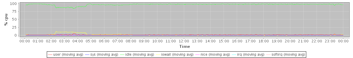 avg(user) = 1.44 avg(sys) = 0.29 avg(idle) = 96.68 avg(iowait) = 1.57 avg(nice) = 0.00 avg(irq) = 0.00 avg(softirq) = 0.01