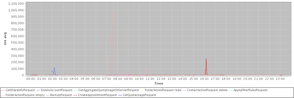avg(GetShareInfoRequest) = 1326.31 avg(DeleteAccountRequest) = 46764.33 avg(GetAggregateQuotaUsageOnServerRequest) = 3473.00 avg(FolderActionRequest.read) = 1782.00 avg(ContactActionRequest.delete) = 988.50 avg(ApplyFilterRulesRequest) = 1986.00 avg(FolderActionRequest.empty) = 18430.72 avg(BackupRequest) = 5043.00 avg(CreateAppointmentRequest) = 1046.70 avg(GetQuotaUsageRequest) = 4690.00