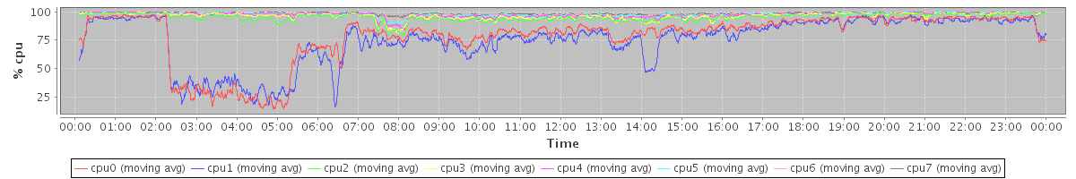 avg(cpu0) = 13.98 avg(cpu1) = 17.97 avg(cpu2) = 0.58 avg(cpu3) = 0.31 avg(cpu4) = 0.16 avg(cpu5) = 0.18 avg(cpu6) = 0.07 avg(cpu7) = 0.07