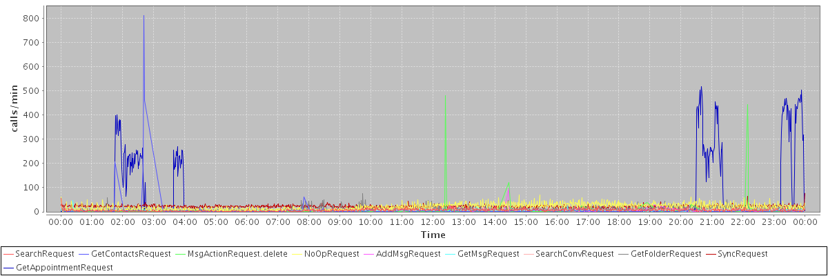 max(SearchRequest) = 55.00 max(GetContactsRequest) = 811.00 max(MsgActionRequest.delete) = 480.00 max(NoOpRequest) = 71.00 max(AddMsgRequest) = 99.00 max(GetMsgRequest) = 46.00 max(SearchConvRequest) = 51.00 max(GetFolderRequest) = 76.00 max(SyncRequest) = 75.00 max(GetAppointmentRequest) = 517.00