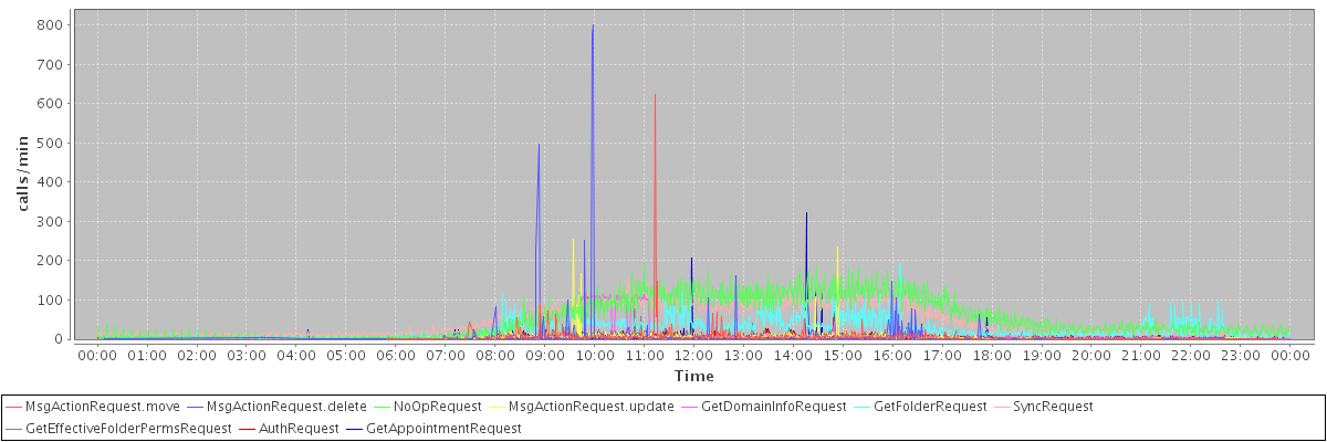 max(MsgActionRequest.move) = 623.00 max(MsgActionRequest.delete) = 802.00 max(NoOpRequest) = 197.00 max(MsgActionRequest.update) = 255.00 max(GetDomainInfoRequest) = 119.00 max(GetFolderRequest) = 193.00 max(SyncRequest) = 155.00 max(GetEffectiveFolderPermsRequest) = 96.00 max(AuthRequest) = 90.00 max(GetAppointmentRequest) = 322.00