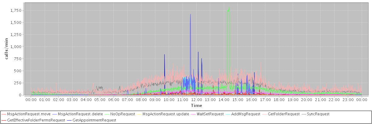 max(MsgActionRequest.move) = 105.00 max(MsgActionRequest.delete) = 1672.00 max(NoOpRequest) = 1824.00 max(MsgActionRequest.update) = 120.00 max(WaitSetRequest) = 141.00 max(AddMsgRequest) = 400.00 max(GetFolderRequest) = 680.00 max(SyncRequest) = 398.00 max(GetEffectiveFolderPermsRequest) = 201.00 max(GetAppointmentRequest) = 895.00