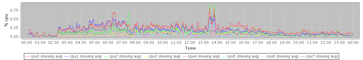 avg(cpu0) = 1.24 avg(cpu1) = 1.02 avg(cpu2) = 0.74 avg(cpu3) = 0.60 avg(cpu4) = 0.48 avg(cpu5) = 0.40 avg(cpu6) = 0.34 avg(cpu7) = 0.74