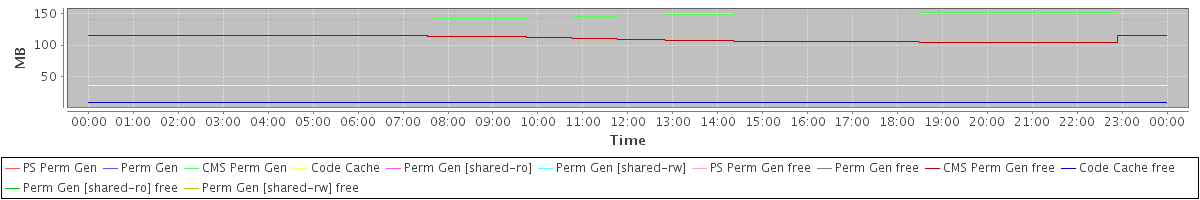avg(PS Perm Gen) = 0.00 avg(Perm Gen) = 0.00 avg(CMS Perm Gen) = 144.95 avg(Code Cache) = 36.63 avg(Perm Gen [shared-ro]) = 0.00 avg(Perm Gen [shared-rw]) = 0.00 avg(PS Perm Gen free) = 0.00 avg(Perm Gen free) = 0.00 avg(CMS Perm Gen free) = 110.06 avg(Code Cache free) = 10.00 avg(Perm Gen [shared-ro] free) = 0.00 avg(Perm Gen [shared-rw] free) = 0.00
