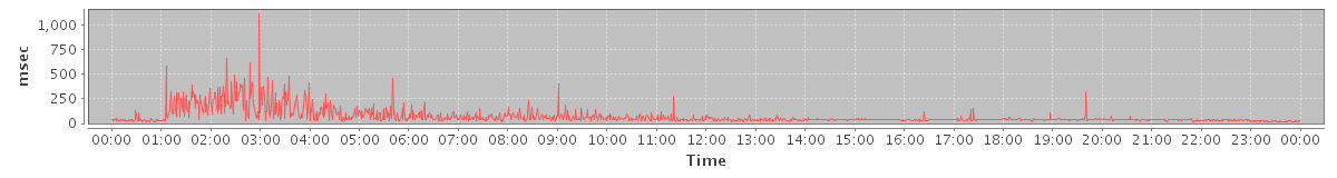 avg(SendMsgRequest) = 402.18 avg(DeleteAccountRequest) = 5883.60 avg(BackupQueryRequest) = 375.60 avg(GetAggregateQuotaUsageOnServerRequest) = 4424.00 avg(GetFreeBusyRequest) = 346.97 avg(ComputeAggregateQuotaUsageRequest) = 4601.00 avg(SendInviteReplyRequest) = 409.43 avg(FolderActionRequest.empty) = 338.83 avg(BackupRequest) = 1634.00 avg(GetQuotaUsageRequest) = 6613.00