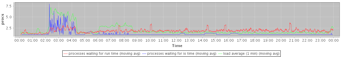 avg(processes waiting for run time) = 1.88 avg(processes waiting for io time) = 0.39 avg(load average (1 min)) = 2.00