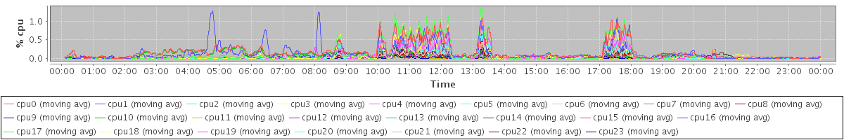 avg(cpu0) = 1.57 avg(cpu1) = 1.19 avg(cpu2) = 0.93 avg(cpu3) = 0.67 avg(cpu4) = 0.60 avg(cpu5) = 0.45 avg(cpu6) = 0.36 avg(cpu7) = 0.26 avg(cpu8) = 0.26 avg(cpu9) = 0.57 avg(cpu10) = 0.80 avg(cpu11) = 0.50 avg(cpu12) = 0.49 avg(cpu13) = 0.45 avg(cpu14) = 0.95 avg(cpu15) = 0.94 avg(cpu16) = 0.63 avg(cpu17) = 0.50 avg(cpu18) = 0.40 avg(cpu19) = 0.64 avg(cpu20) = 0.44 avg(cpu21) = 0.62 avg(cpu22) = 0.38 avg(cpu23) = 0.79