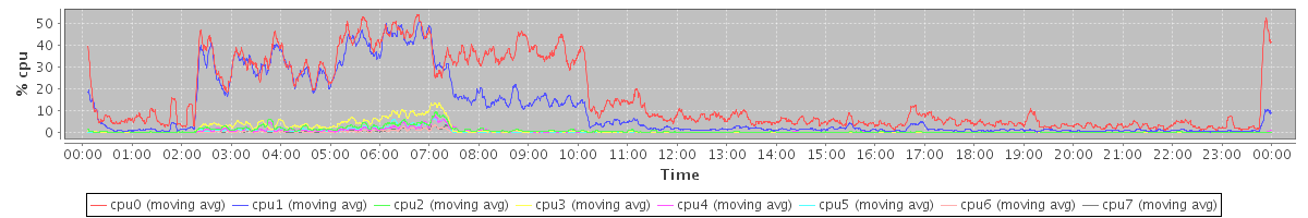 avg(cpu0) = 1.09 avg(cpu1) = 1.01 avg(cpu2) = 0.64 avg(cpu3) = 0.59 avg(cpu4) = 0.45 avg(cpu5) = 0.42 avg(cpu6) = 0.32 avg(cpu7) = 0.30