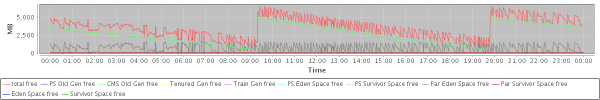 avg(total free) = 3596.52 avg(PS Old Gen free) = 0.00 avg(CMS Old Gen free) = 2635.43 avg(Tenured Gen free) = 0.00 avg(Train Gen free) = 0.00 avg(PS Eden Space free) = 0.00 avg(PS Survivor Space free) = 0.00 avg(Par Eden Space free) = 795.67 avg(Par Survivor Space free) = 165.42 avg(Eden Space free) = 0.00 avg(Survivor Space free) = 0.00