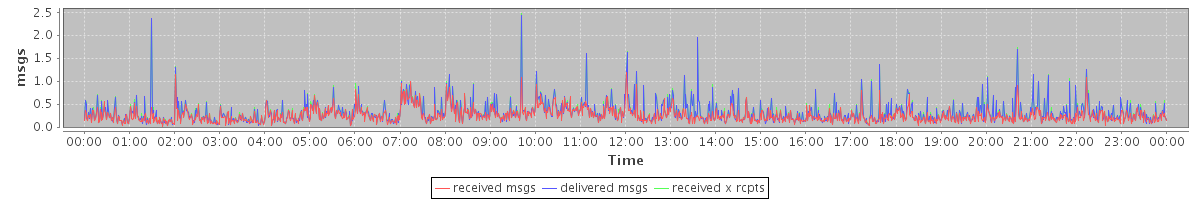 avg(received msgs) = 0.25 avg(delivered msgs) = 0.30 avg(received x rcpts) = 0.32