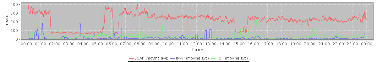 avg(SendMsgRequest) = 411.91 avg(BackupQueryRequest) = 230.20 avg(GetAggregateQuotaUsageOnServerRequest) = 1476.00 avg(GetFreeBusyRequest) = 206.86 avg(SendInviteReplyRequest) = 449.25 avg(RemoveAttachmentsRequest) = 1211.10 avg(SetTaskRequest) = 501.00 avg(FolderActionRequest.empty) = 683.41 avg(BackupRequest) = 1065.50 avg(GetQuotaUsageRequest) = 1572.00