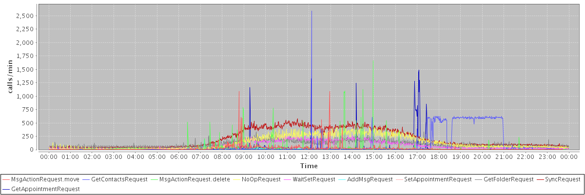 max(MsgActionRequest.move) = 1090.00 max(GetContactsRequest) = 2593.00 max(MsgActionRequest.delete) = 1663.00 max(NoOpRequest) = 424.00 max(WaitSetRequest) = 280.00 max(AddMsgRequest) = 207.00 max(SetAppointmentRequest) = 261.00 max(GetFolderRequest) = 416.00 max(SyncRequest) = 581.00 max(GetAppointmentRequest) = 1490.00