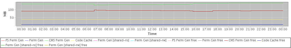 avg(PS Perm Gen) = 0.00 avg(Perm Gen) = 0.00 avg(CMS Perm Gen) = 136.41 avg(Code Cache) = 39.28 avg(Perm Gen [shared-ro]) = 0.00 avg(Perm Gen [shared-rw]) = 0.00 avg(PS Perm Gen free) = 0.00 avg(Perm Gen free) = 0.00 avg(CMS Perm Gen free) = 93.18 avg(Code Cache free) = 7.35 avg(Perm Gen [shared-ro] free) = 0.00 avg(Perm Gen [shared-rw] free) = 0.00