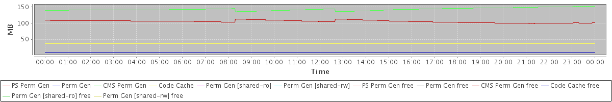 avg(PS Perm Gen) = 0.00 avg(Perm Gen) = 0.00 avg(CMS Perm Gen) = 143.24 avg(Code Cache) = 36.75 avg(Perm Gen [shared-ro]) = 0.00 avg(Perm Gen [shared-rw]) = 0.00 avg(PS Perm Gen free) = 0.00 avg(Perm Gen free) = 0.00 avg(CMS Perm Gen free) = 105.54 avg(Code Cache free) = 9.88 avg(Perm Gen [shared-ro] free) = 0.00 avg(Perm Gen [shared-rw] free) = 0.00