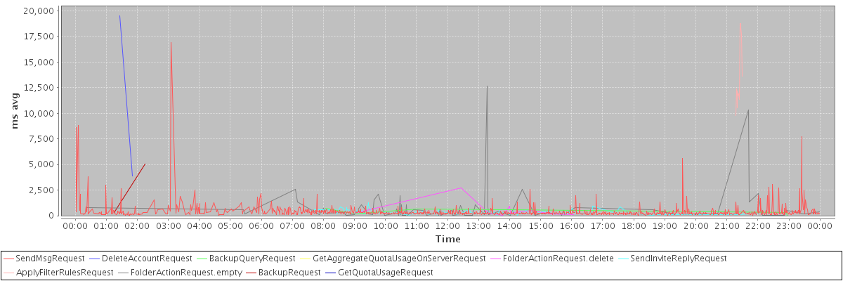 avg(SendMsgRequest) = 386.50 avg(DeleteAccountRequest) = 11683.50 avg(BackupQueryRequest) = 413.33 avg(GetAggregateQuotaUsageOnServerRequest) = 1626.00 avg(FolderActionRequest.delete) = 430.42 avg(SendInviteReplyRequest) = 316.89 avg(ApplyFilterRulesRequest) = 13742.15 avg(FolderActionRequest.empty) = 785.44 avg(BackupRequest) = 2676.00 avg(GetQuotaUsageRequest) = 1796.00