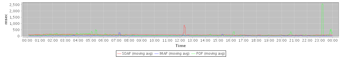 avg(FolderActionRequest.sync) = 7644.00 avg(SendMsgRequest) = 643.59 avg(DeleteAccountRequest) = 1730.80 avg(GetAggregateQuotaUsageOnServerRequest) = 1088.00 avg(WaitSetRequest) = 202.15 avg(SendInviteReplyRequest) = 224.19 avg(ForwardAppointmentRequest) = 269.00 avg(FolderActionRequest.empty) = 393.48 avg(BackupRequest) = 3135.00 avg(GetQuotaUsageRequest) = 1136.00