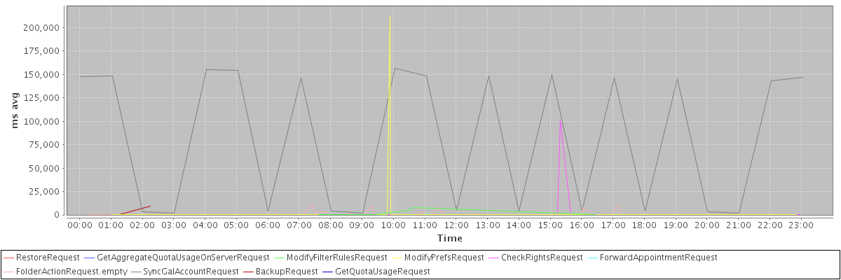 avg(RestoreRequest) = 98708.00 avg(GetAggregateQuotaUsageOnServerRequest) = 1834.00 avg(ModifyFilterRulesRequest) = 3393.80 avg(ModifyPrefsRequest) = 1219.23 avg(CheckRightsRequest) = 869.28 avg(ForwardAppointmentRequest) = 502.00 avg(FolderActionRequest.empty) = 773.44 avg(SyncGalAccountRequest) = 82245.75 avg(BackupRequest) = 5125.50 avg(GetQuotaUsageRequest) = 1941.00
