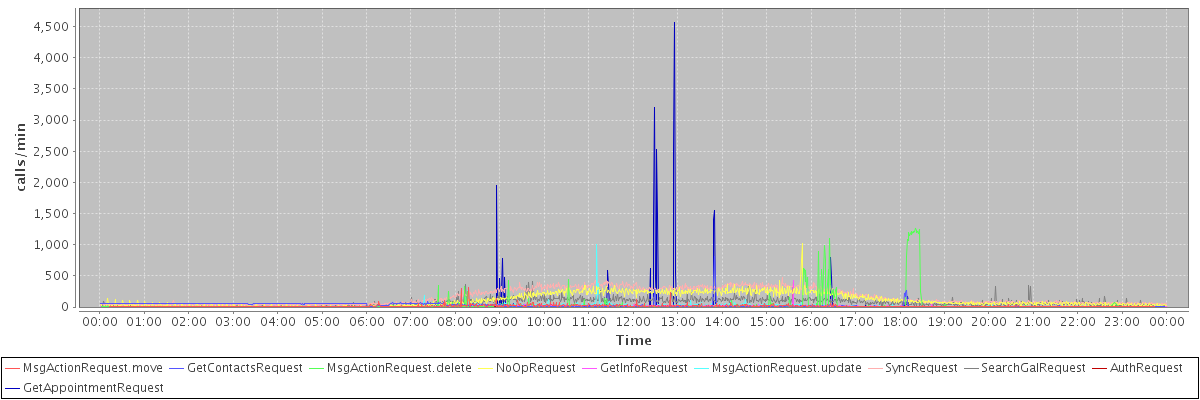max(MsgActionRequest.move) = 319.00 max(GetContactsRequest) = 807.00 max(MsgActionRequest.delete) = 1254.00 max(NoOpRequest) = 1024.00 max(GetInfoRequest) = 427.00 max(MsgActionRequest.update) = 1005.00 max(SyncRequest) = 479.00 max(SearchGalRequest) = 402.00 max(AuthRequest) = 415.00 max(GetAppointmentRequest) = 4569.00