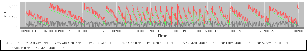 avg(total free) = 3138.58 avg(PS Old Gen free) = 0.00 avg(CMS Old Gen free) = 2269.51 avg(Tenured Gen free) = 0.00 avg(Train Gen free) = 0.00 avg(PS Eden Space free) = 0.00 avg(PS Survivor Space free) = 0.00 avg(Par Eden Space free) = 804.69 avg(Par Survivor Space free) = 64.37 avg(Eden Space free) = 0.00 avg(Survivor Space free) = 0.00