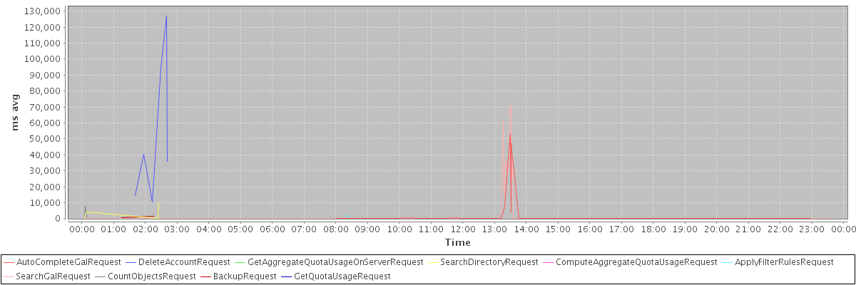 avg(AutoCompleteGalRequest) = 1607.51 avg(DeleteAccountRequest) = 53881.67 avg(GetAggregateQuotaUsageOnServerRequest) = 3067.00 avg(SearchDirectoryRequest) = 3307.20 avg(ComputeAggregateQuotaUsageRequest) = 5125.00 avg(ApplyFilterRulesRequest) = 1074.57 avg(SearchGalRequest) = 1134.57 avg(CountObjectsRequest) = 3259.33 avg(BackupRequest) = 1279.00 avg(GetQuotaUsageRequest) = 3996.00