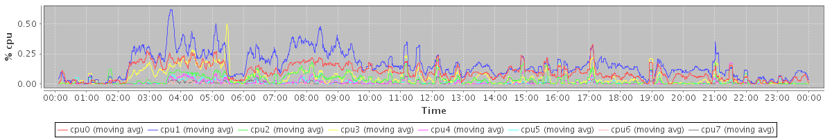 avg(cpu0) = 8.82 avg(cpu1) = 12.45 avg(cpu2) = 0.65 avg(cpu3) = 0.46 avg(cpu4) = 0.19 avg(cpu5) = 0.18 avg(cpu6) = 0.05 avg(cpu7) = 0.09