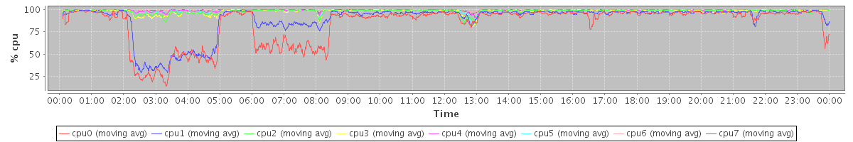 avg(cpu0) = 10.74 avg(cpu1) = 5.91 avg(cpu2) = 0.31 avg(cpu3) = 0.42 avg(cpu4) = 0.11 avg(cpu5) = 0.11 avg(cpu6) = 0.03 avg(cpu7) = 0.03