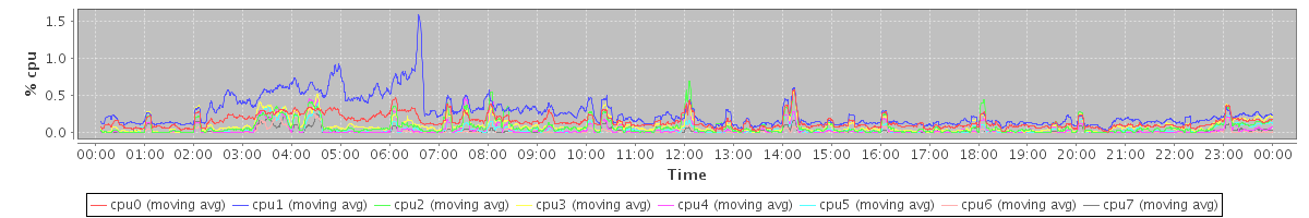 avg(cpu0) = 1.04 avg(cpu1) = 1.21 avg(cpu2) = 0.58 avg(cpu3) = 0.63 avg(cpu4) = 0.37 avg(cpu5) = 0.41 avg(cpu6) = 0.25 avg(cpu7) = 0.25