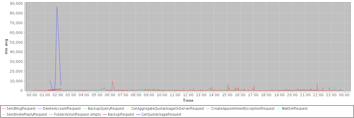 avg(SendMsgRequest) = 379.27 avg(DeleteAccountRequest) = 17092.67 avg(BackupQueryRequest) = 199.80 avg(GetAggregateQuotaUsageOnServerRequest) = 936.00 avg(CreateAppointmentExceptionRequest) = 426.00 avg(WaitSetRequest) = 456.57 avg(SendInviteReplyRequest) = 275.71 avg(FolderActionRequest.empty) = 253.90 avg(BackupRequest) = 1014.00 avg(GetQuotaUsageRequest) = 1023.00