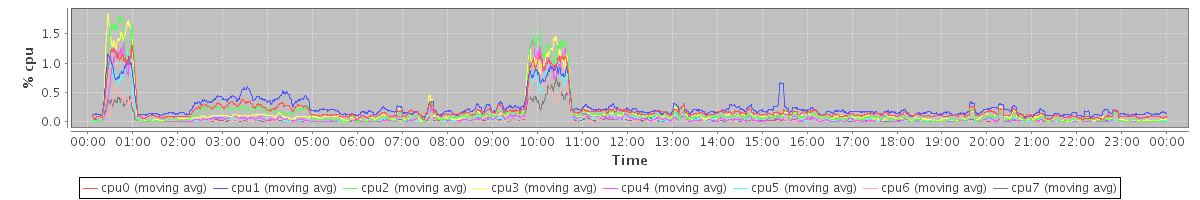 avg(cpu0) = 7.95 avg(cpu1) = 11.62 avg(cpu2) = 0.78 avg(cpu3) = 0.44 avg(cpu4) = 0.23 avg(cpu5) = 0.20 avg(cpu6) = 0.10 avg(cpu7) = 0.09