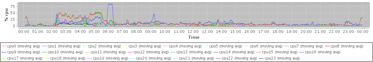 avg(cpu0) = 1.49 avg(cpu1) = 1.19 avg(cpu2) = 0.82 avg(cpu3) = 0.64 avg(cpu4) = 0.61 avg(cpu5) = 0.50 avg(cpu6) = 0.43 avg(cpu7) = 0.36 avg(cpu8) = 0.32 avg(cpu9) = 0.88 avg(cpu10) = 1.00 avg(cpu11) = 0.51 avg(cpu12) = 0.52 avg(cpu13) = 0.57 avg(cpu14) = 1.05 avg(cpu15) = 1.17 avg(cpu16) = 0.68 avg(cpu17) = 0.64 avg(cpu18) = 0.56 avg(cpu19) = 0.47 avg(cpu20) = 0.49 avg(cpu21) = 0.59 avg(cpu22) = 0.41 avg(cpu23) = 0.92