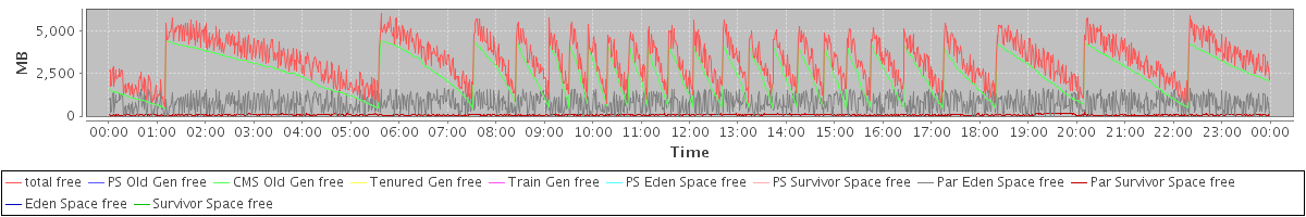 avg(total free) = 3328.37 avg(PS Old Gen free) = 0.00 avg(CMS Old Gen free) = 2469.19 avg(Tenured Gen free) = 0.00 avg(Train Gen free) = 0.00 avg(PS Eden Space free) = 0.00 avg(PS Survivor Space free) = 0.00 avg(Par Eden Space free) = 787.41 avg(Par Survivor Space free) = 71.77 avg(Eden Space free) = 0.00 avg(Survivor Space free) = 0.00