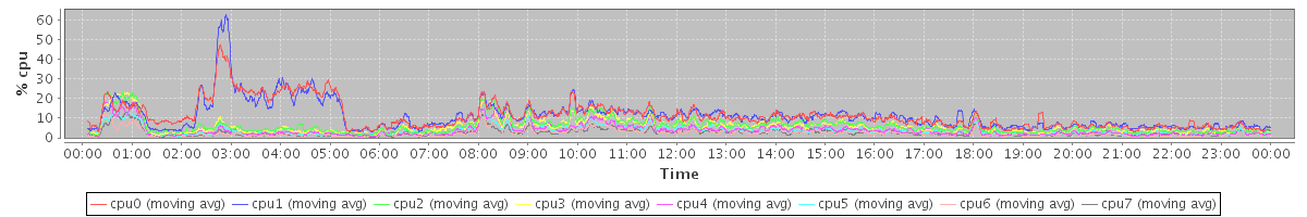 avg(cpu0) = 7.88 avg(cpu1) = 10.13 avg(cpu2) = 0.77 avg(cpu3) = 0.50 avg(cpu4) = 0.26 avg(cpu5) = 0.22 avg(cpu6) = 0.12 avg(cpu7) = 0.10