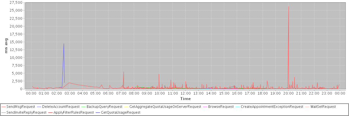 avg(SendMsgRequest) = 343.24 avg(DeleteAccountRequest) = 4410.00 avg(BackupQueryRequest) = 376.80 avg(GetAggregateQuotaUsageOnServerRequest) = 647.00 avg(BrowseRequest) = 189.20 avg(CreateAppointmentExceptionRequest) = 245.20 avg(WaitSetRequest) = 172.90 avg(SendInviteReplyRequest) = 279.72 avg(ApplyFilterRulesRequest) = 1997.00 avg(GetQuotaUsageRequest) = 733.00