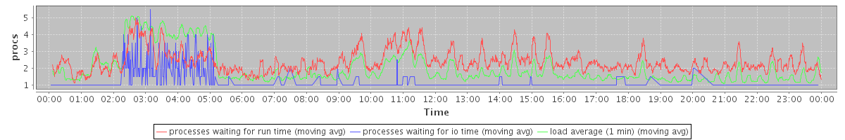 avg(processes waiting for run time) = 2.40 avg(processes waiting for io time) = 0.26 avg(load average (1 min)) = 1.99