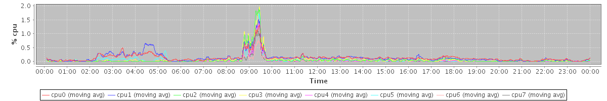 avg(cpu0) = 0.13 avg(cpu1) = 0.14 avg(cpu2) = 0.06 avg(cpu3) = 0.07 avg(cpu4) = 0.03 avg(cpu5) = 0.05 avg(cpu6) = 0.02 avg(cpu7) = 0.02