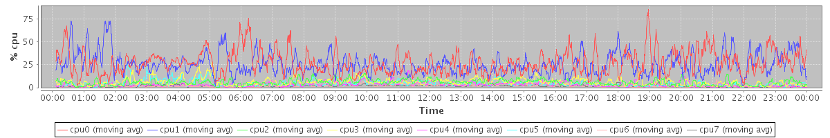 avg(cpu0) = 6.26 avg(cpu1) = 8.00 avg(cpu2) = 0.84 avg(cpu3) = 0.78 avg(cpu4) = 0.28 avg(cpu5) = 0.53 avg(cpu6) = 0.08 avg(cpu7) = 0.25