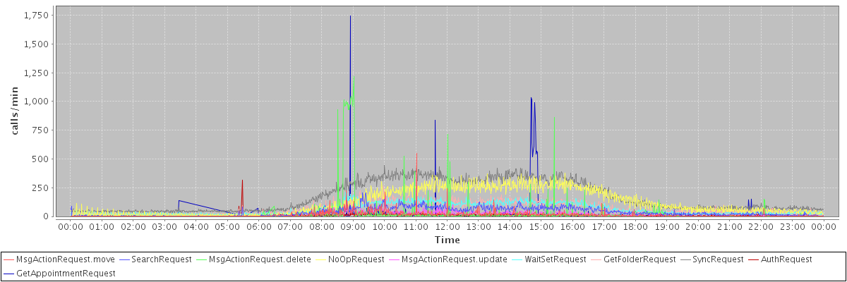 max(MsgActionRequest.move) = 550.00 max(SearchRequest) = 205.00 max(MsgActionRequest.delete) = 1218.00 max(NoOpRequest) = 378.00 max(MsgActionRequest.update) = 223.00 max(WaitSetRequest) = 209.00 max(GetFolderRequest) = 265.00 max(SyncRequest) = 443.00 max(AuthRequest) = 315.00 max(GetAppointmentRequest) = 1747.00