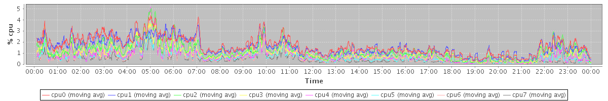 avg(cpu0) = 10.09 avg(cpu1) = 13.24 avg(cpu2) = 1.08 avg(cpu3) = 0.63 avg(cpu4) = 0.39 avg(cpu5) = 0.35 avg(cpu6) = 0.19 avg(cpu7) = 0.18