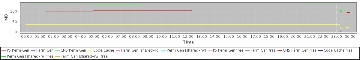avg(PS Perm Gen) = 0.00 avg(Perm Gen) = 0.00 avg(CMS Perm Gen) = 134.07 avg(Code Cache) = 36.56 avg(Perm Gen [shared-ro]) = 0.00 avg(Perm Gen [shared-rw]) = 0.00 avg(PS Perm Gen free) = 0.00 avg(Perm Gen free) = 0.00 avg(CMS Perm Gen free) = 101.75 avg(Code Cache free) = 9.36 avg(Perm Gen [shared-ro] free) = 0.00 avg(Perm Gen [shared-rw] free) = 0.00