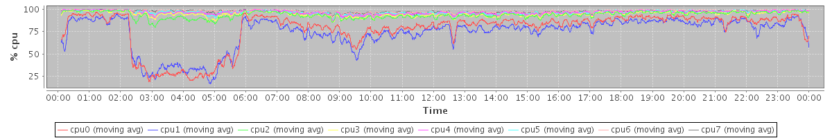 avg(cpu0) = 1.31 avg(cpu1) = 1.31 avg(cpu2) = 0.87 avg(cpu3) = 0.79 avg(cpu4) = 0.58 avg(cpu5) = 0.54 avg(cpu6) = 0.41 avg(cpu7) = 0.37