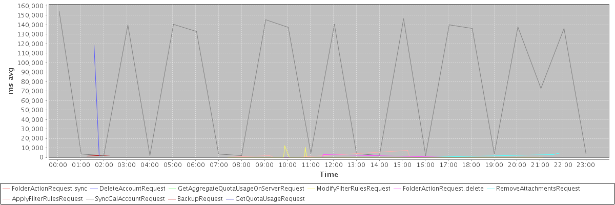 avg(FolderActionRequest.sync) = 1567.00 avg(DeleteAccountRequest) = 60021.50 avg(GetAggregateQuotaUsageOnServerRequest) = 1079.00 avg(ModifyFilterRulesRequest) = 605.53 avg(FolderActionRequest.delete) = 567.83 avg(RemoveAttachmentsRequest) = 596.75 avg(ApplyFilterRulesRequest) = 1685.00 avg(SyncGalAccountRequest) = 74678.67 avg(BackupRequest) = 1917.00 avg(GetQuotaUsageRequest) = 1072.00