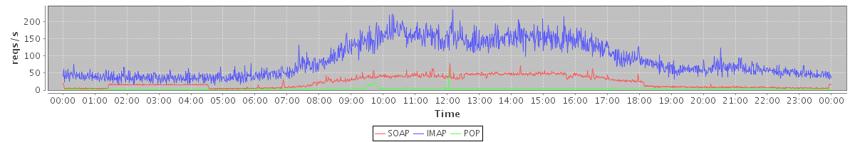 Host zm05.stanford.edu: Mailboxd: Request Rate by Client Protocol