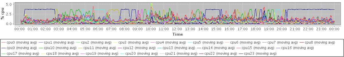 avg(cpu0) = 0.16 avg(cpu1) = 0.18 avg(cpu2) = 0.10 avg(cpu3) = 0.08 avg(cpu4) = 0.06 avg(cpu5) = 0.04 avg(cpu6) = 0.04 avg(cpu7) = 0.02 avg(cpu8) = 0.02 avg(cpu9) = 0.01 avg(cpu10) = 0.08 avg(cpu11) = 0.00 avg(cpu12) = 0.02 avg(cpu13) = 0.03 avg(cpu14) = 0.06 avg(cpu15) = 0.06 avg(cpu16) = 0.05 avg(cpu17) = 0.05 avg(cpu18) = 0.06 avg(cpu19) = 0.05 avg(cpu20) = 0.06 avg(cpu21) = 0.00 avg(cpu22) = 0.01 avg(cpu23) = 0.00