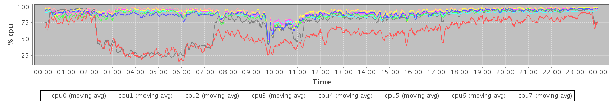 avg(cpu0) = 59.43 avg(cpu1) = 89.09 avg(cpu2) = 88.14 avg(cpu3) = 92.16 avg(cpu4) = 91.13 avg(cpu5) = 88.11 avg(cpu6) = 93.84 avg(cpu7) = 74.09