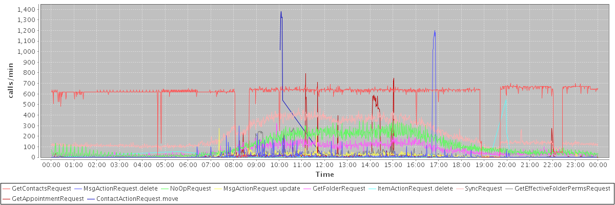 max(GetContactsRequest) = 699.00 max(MsgActionRequest.delete) = 1197.00 max(NoOpRequest) = 350.00 max(MsgActionRequest.update) = 275.00 max(GetFolderRequest) = 321.00 max(ItemActionRequest.delete) = 545.00 max(SyncRequest) = 480.00 max(GetEffectiveFolderPermsRequest) = 279.00 max(GetAppointmentRequest) = 792.00 max(ContactActionRequest.move) = 1380.00