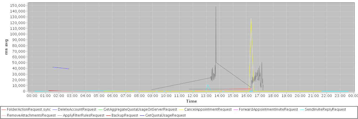 avg(FolderActionRequest.sync) = 4086.67 avg(DeleteAccountRequest) = 40973.00 avg(GetAggregateQuotaUsageOnServerRequest) = 1195.00 avg(CancelAppointmentRequest) = 1444.72 avg(ForwardAppointmentInviteRequest) = 542.00 avg(SendInviteReplyRequest) = 538.54 avg(RemoveAttachmentsRequest) = 799.77 avg(ApplyFilterRulesRequest) = 25024.88 avg(BackupRequest) = 1022.00 avg(GetQuotaUsageRequest) = 1370.00