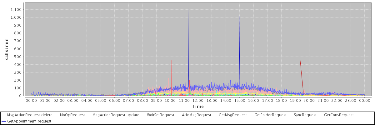 max(MsgActionRequest.delete) = 459.00 max(NoOpRequest) = 204.00 max(MsgActionRequest.update) = 78.00 max(WaitSetRequest) = 69.00 max(AddMsgRequest) = 76.00 max(GetMsgRequest) = 89.00 max(GetFolderRequest) = 225.00 max(SyncRequest) = 125.00 max(GetConvRequest) = 494.00 max(GetAppointmentRequest) = 1133.00