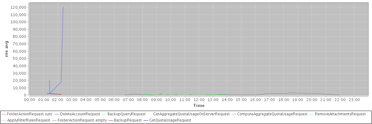 avg(FolderActionRequest.sync) = 1619.00 avg(DeleteAccountRequest) = 40403.50 avg(BackupQueryRequest) = 611.80 avg(GetAggregateQuotaUsageOnServerRequest) = 1122.00 avg(ComputeAggregateQuotaUsageRequest) = 3485.00 avg(RemoveAttachmentsRequest) = 673.00 avg(ApplyFilterRulesRequest) = 6305.00 avg(FolderActionRequest.empty) = 410.78 avg(BackupRequest) = 1633.00 avg(GetQuotaUsageRequest) = 1300.00